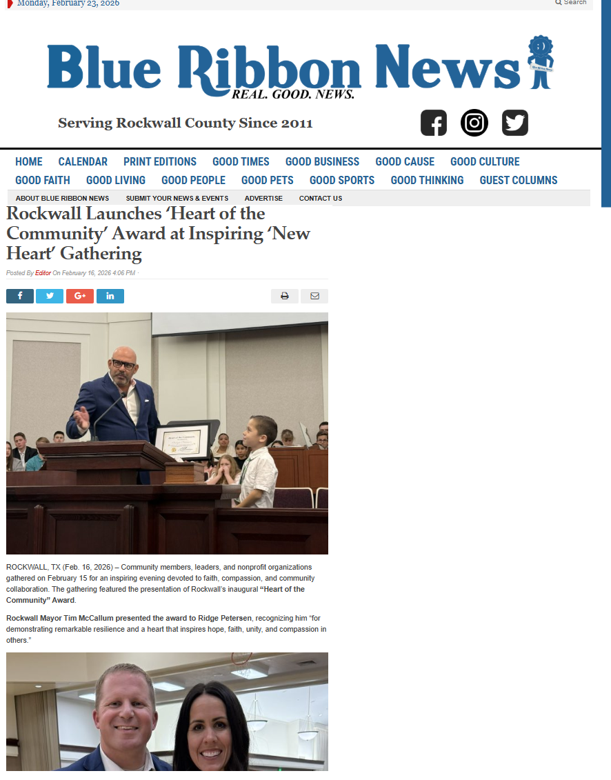 Blue Ribbon News: Rockwall Launches ‘Heart of the Community’ Award at Inspiring ‘New Heart’ Gathering