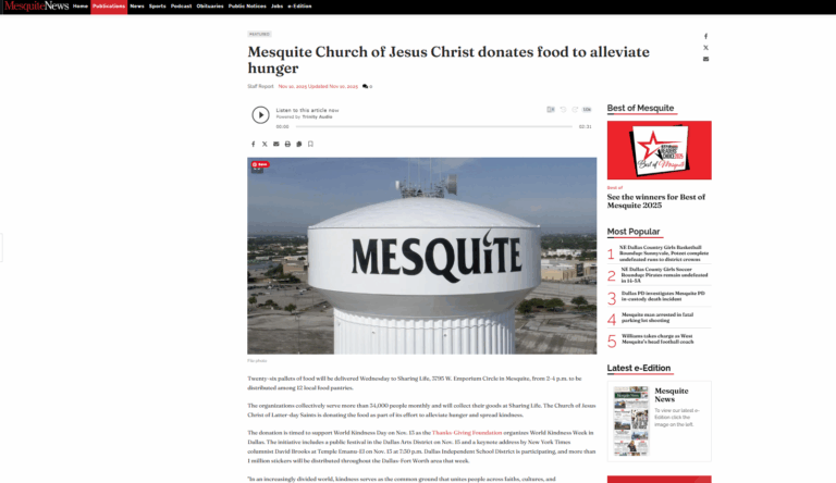 Hunger Relief - Food Banks, In the News, In the News Homepage, Kindness Week, The Church of Jesus Christ of Latter-day Saints Mesquite News: Mesquite Church of Jesus Christ donates food to alleviate hunger November 15, 2025 by Jill Taylor